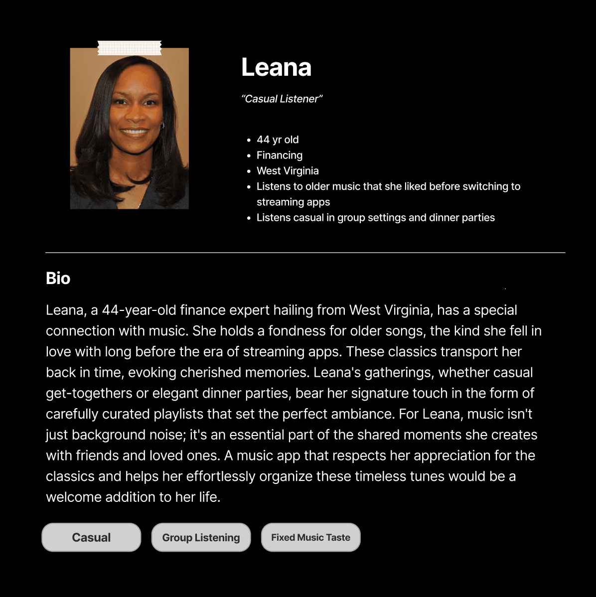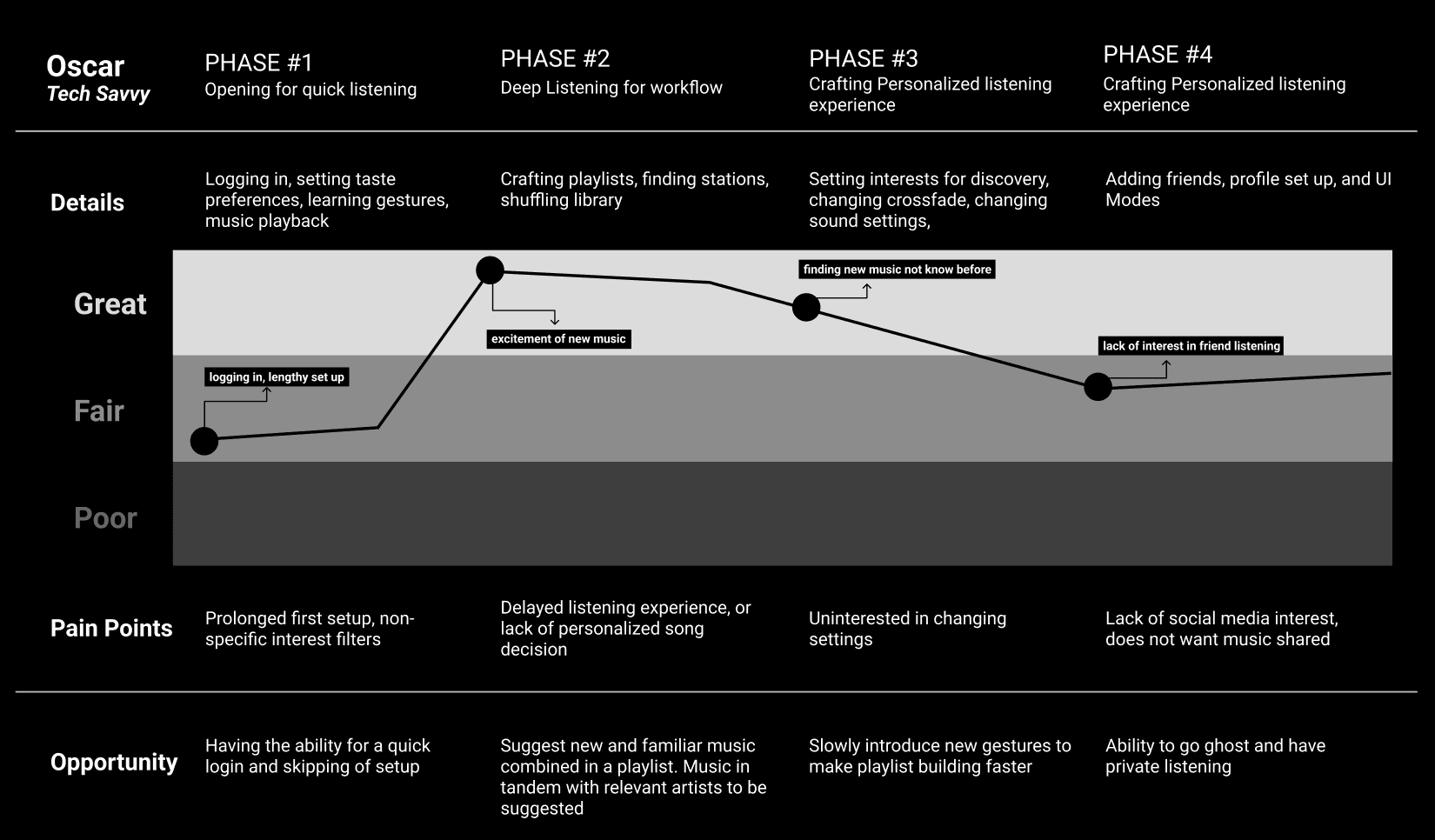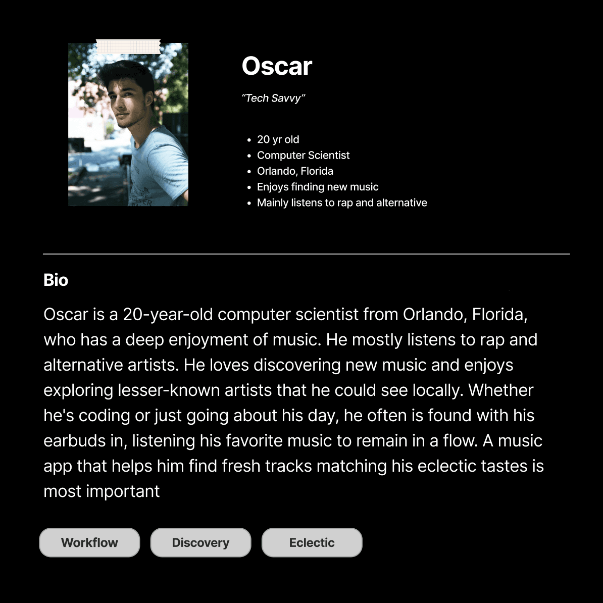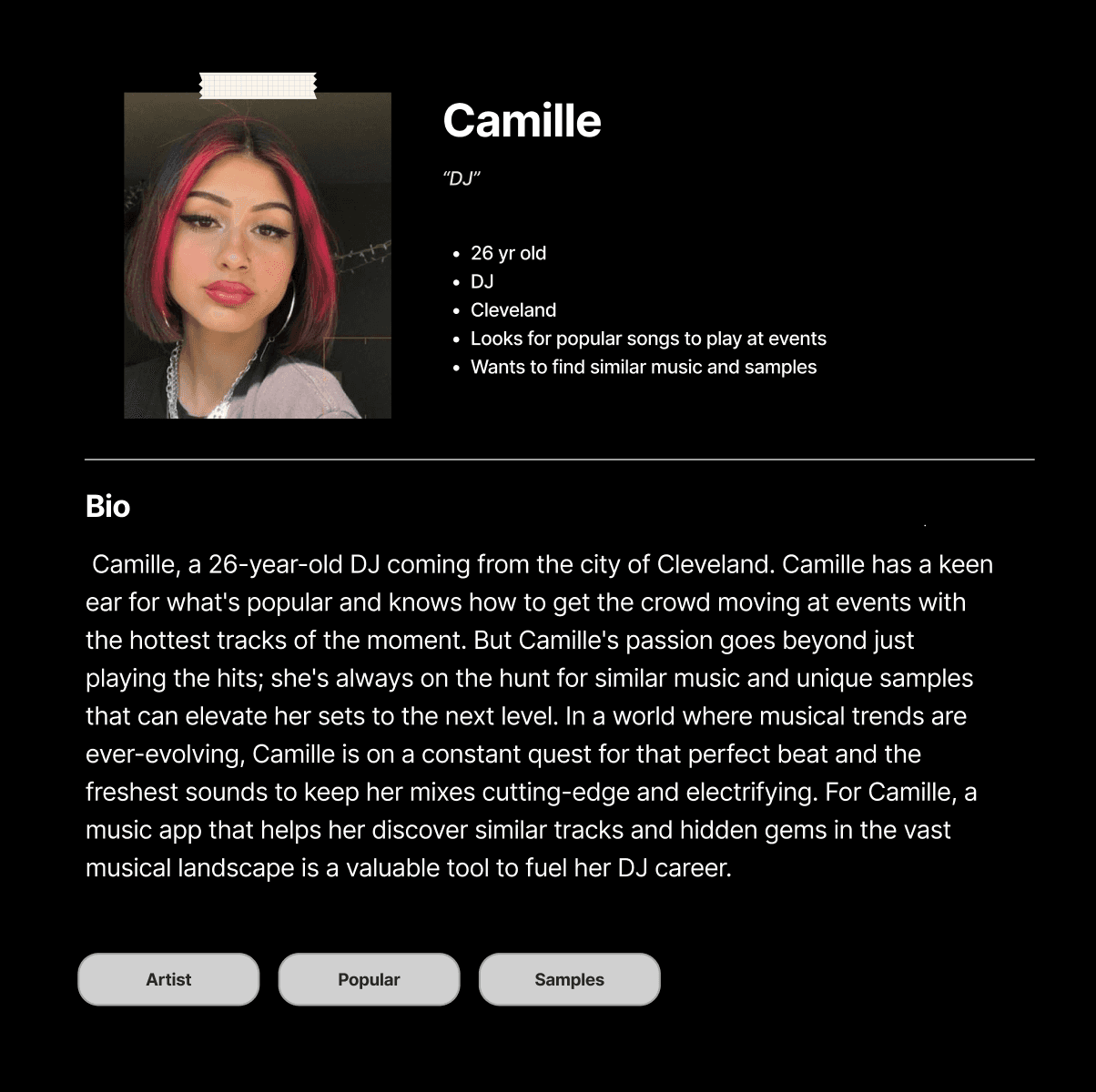Crafting user personas. I created personas to reflect the needs and problems of my audience. By mapping user flows and pain points, I designed with purpose while laying out application wireframes. Through case studies and student collaboration, I observed how listeners use music apps and what they look for. These developed personas clarified expected qualities, motivations, pain points, and informed user flows and wireframes.